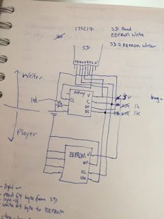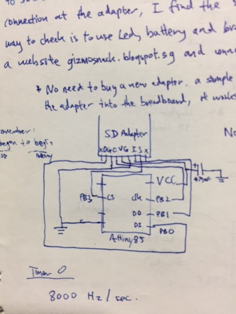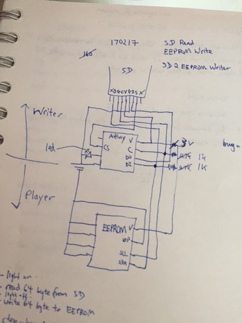 After doing a SD player, I continue to do a EEPROM player. First, I use what I learn in my earlier post to build a SD to EEPROM WRITER using an Attiny85. Then, I turn on PWM to play the music from the EEPROM. So it is possible to use I2C and SPI together in Attiny85. I2C is used to talk to the external microchip memory 24LC256 DIP while SPI is used to talk to the SD card. The trick is to use beginTiny before each write (see source code below). The work is motivated by my 3 years old daughter who want a good Barney song in her Barney stuff toy. Next I will move to Winbond Flash with Attiny85 which I could hold the whole song.