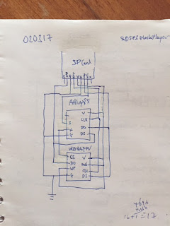 The circuit consists of 2 main function. 1) To read music data from microSD card in the SD card adapter and write to the W25Q64FV external Flash memory. 2) To read music data from W25Q64FV and play the speaker.