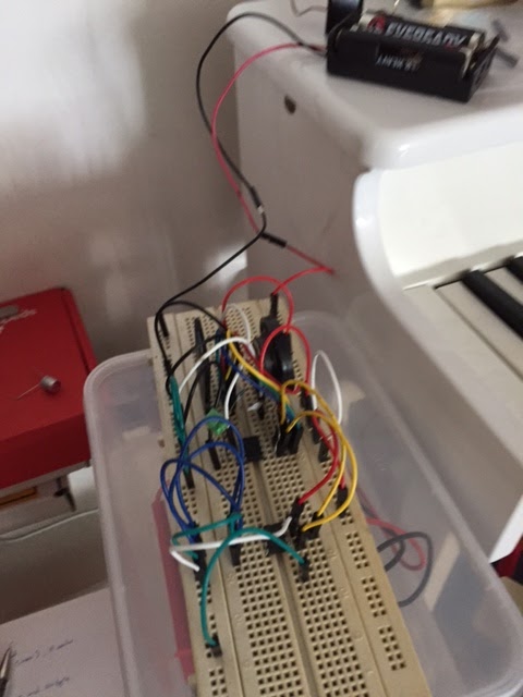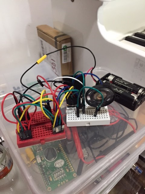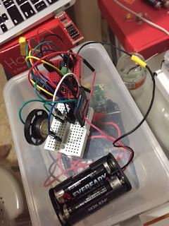 The mini white breadboard has the SD adapter and speaker with transistor.