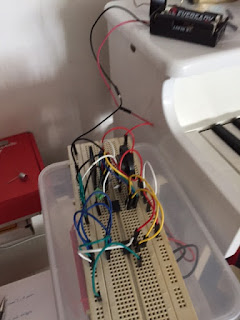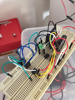 The red mini breadboard has the external flash memory W25Q64FV and Attiny85.